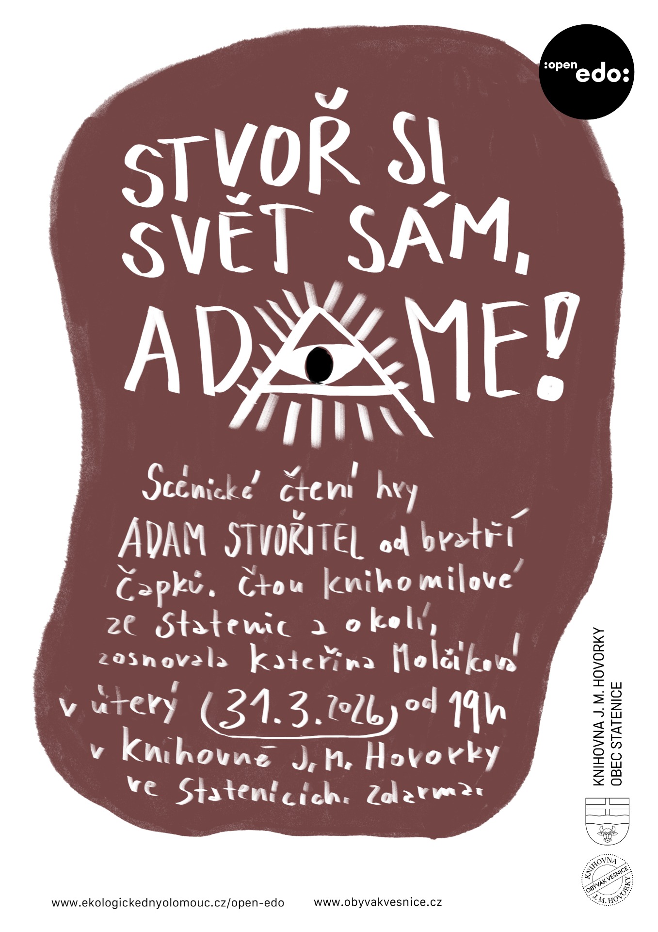 V úterý 31. 3. 2026 od 19:00 / Scénické čtení hry Adam stvořitel od bratří Čapků. Čtou Adamové a Evy ze Statenic pod režijním a dramaturgickým vedením Kateřiny Molčíkové. Čeká vás hluboký a podnětný kulturní zážitek, který nutí k přemýšlení, a zároveň radostné sousedské setkání, kde nechybí humor a nakažlivá energie ze společného čtení.